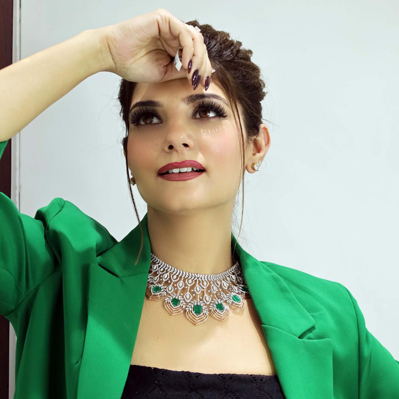 A regal diamond necklace featuring emeralds like in a peacock feather, adding charm to every outfit.