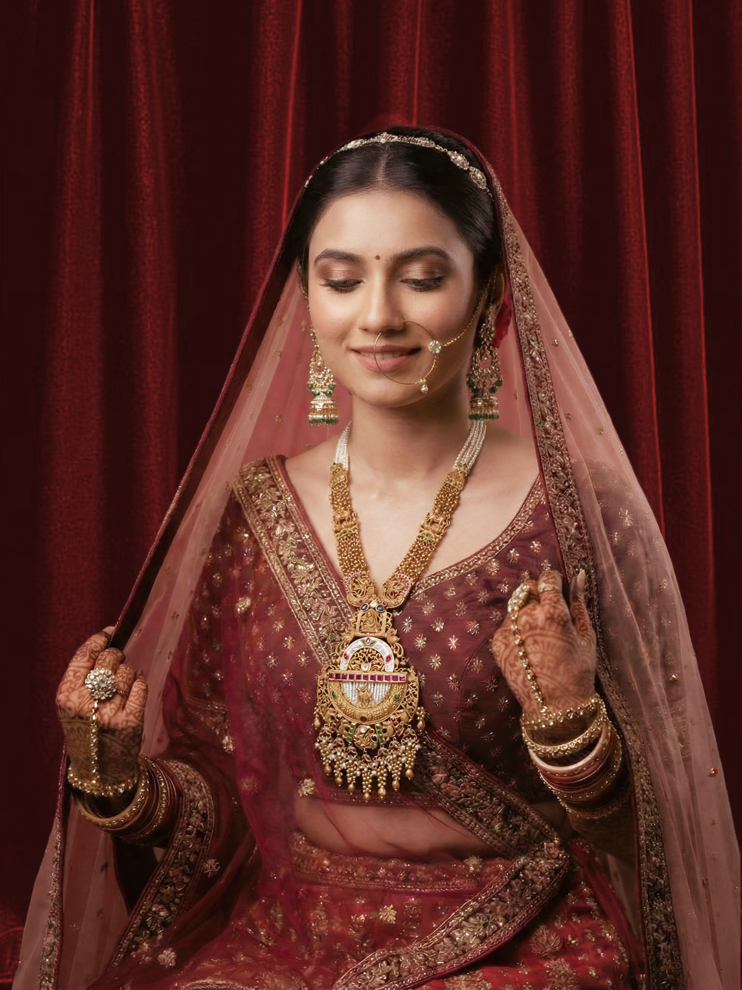 Designed as a statement bridal necklace set, this piece showcases heritage gold artistry. Perfect for brides seeking a traditional yet impactful jewellery look for wedding ceremonies.