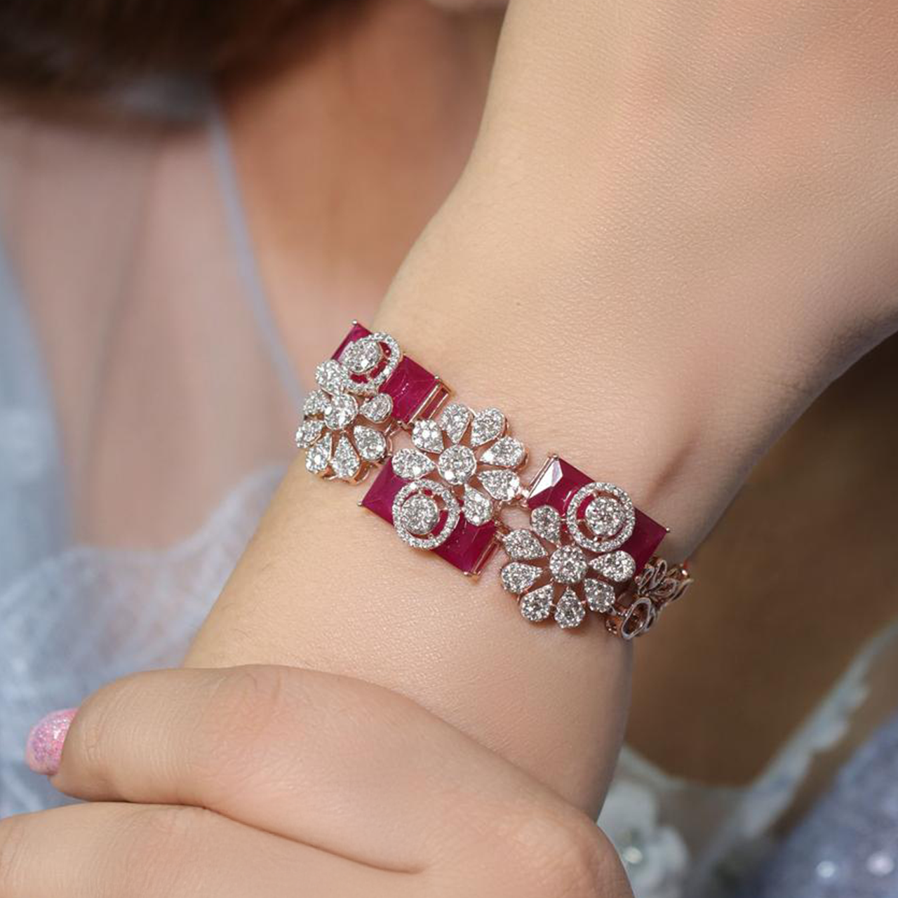 A striking floral bracelet featuring radiant ruby squares and shimmering diamond-studded flowers, set in a graceful rose gold band.